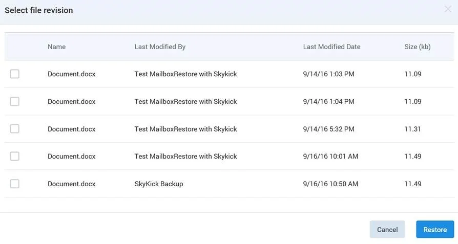 One screenshot we'd like to share with you is that of selecting a version of a document to restore. Once you’ve found a document you’d like to restore (in this case a test file in OneDrive) then you can click on the document title and see the backup points and file sizes so that you can choose the restore point. You just select the version you want and then hit Restore and it will be restored to the origin. If the original file still exists in that location, then it will restore with a ‘-1’ notation on the end etc.