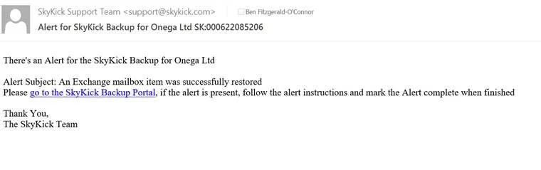 This example email alerts to confirm that that an Office 365 restore operation completed successfully. Equally alerts are issued when there is a backup problem and when new mailboxes or OneDrive / SharePoint sites are added.