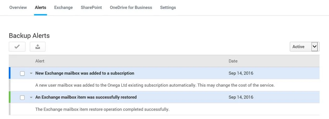 A. Currently the system issues alerts / notifications for admin purposes which are emailed and maintained in the portal. These alerts relate to matters such as a mailbox which is inaccessible for backup (eg if mailbox deleted this would occur), and when restores are completed etc. A couple of examples here from our te