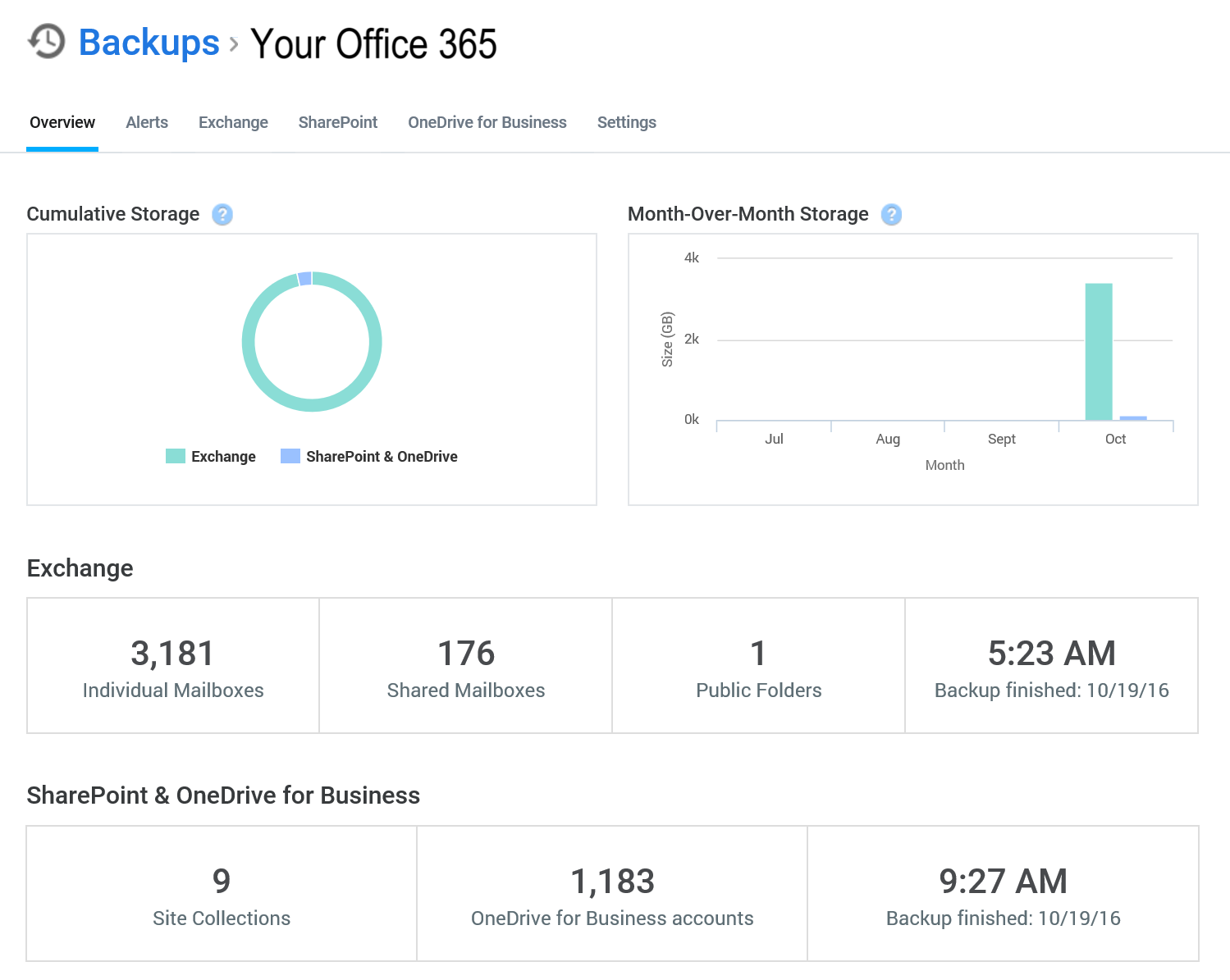 A. The backups run reliably in the background, and alerts are issued when there are any problems to attend to, or when the system notes that you new accounts have been added. Most of the admin in done via a very effective web portal that we can give you access (if you are an administrator on your company Office 365 account) to, and through which we also help administer the backup system. You can see here how much data is backed up, and when your last full backup completed, select and de-select mailboxes from backup, run searches and trigger restores when needed etc. The overview page will also show a summary similar to the example below here: